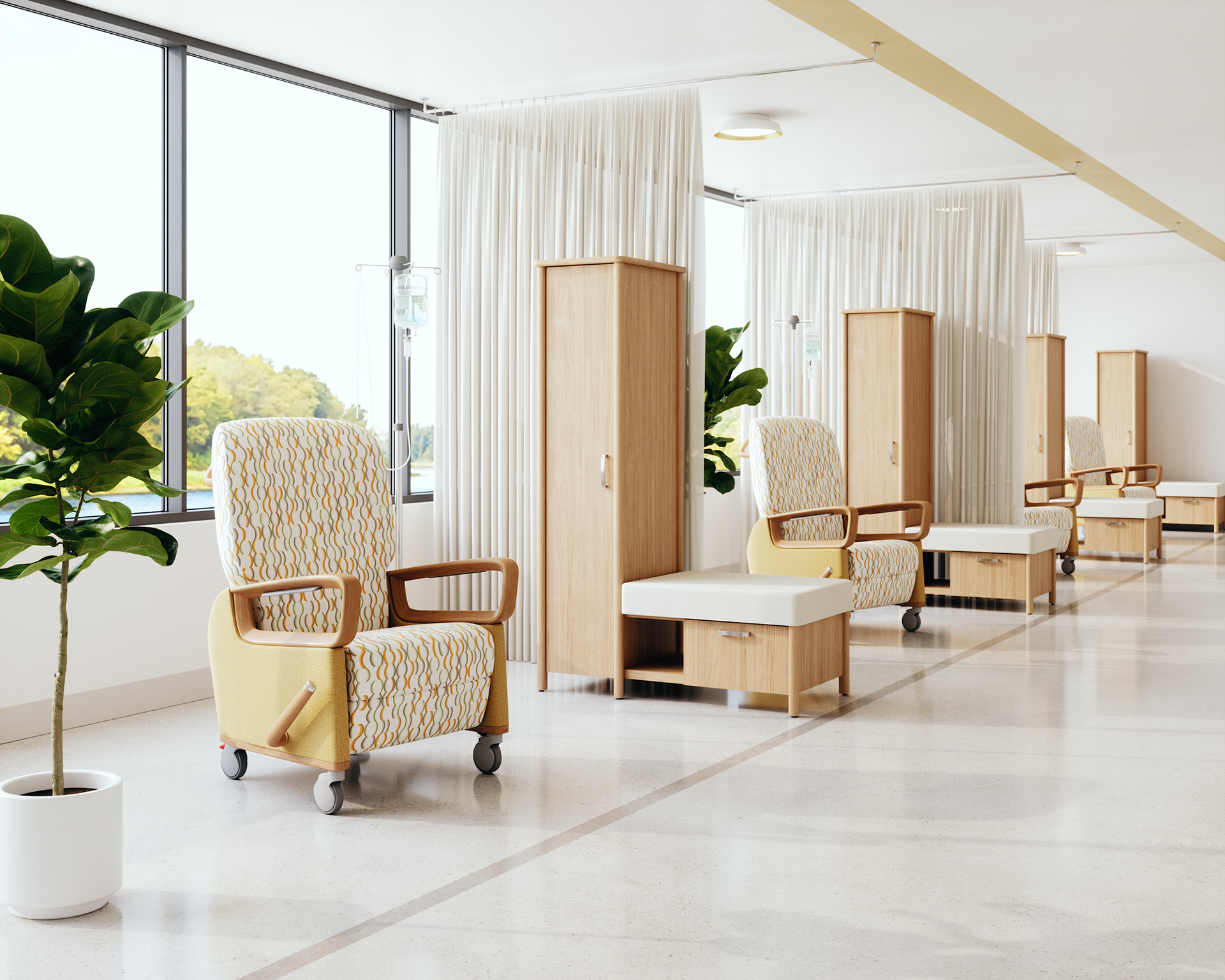 The Ethan collection for Kwalu blends a refined minimalist style with the durability required for healthcare settings. Its soft, rounded forms bring subtle functional elegance, fostering a calming environment for healing. This comprehensive collection of casegoods feature a range of storage cabinetry, along with more innovative configurations such as a hybrid wardrobe with integrated bench, a bedside cabinet housing an easy to move pouf and a tailored mobile cart.