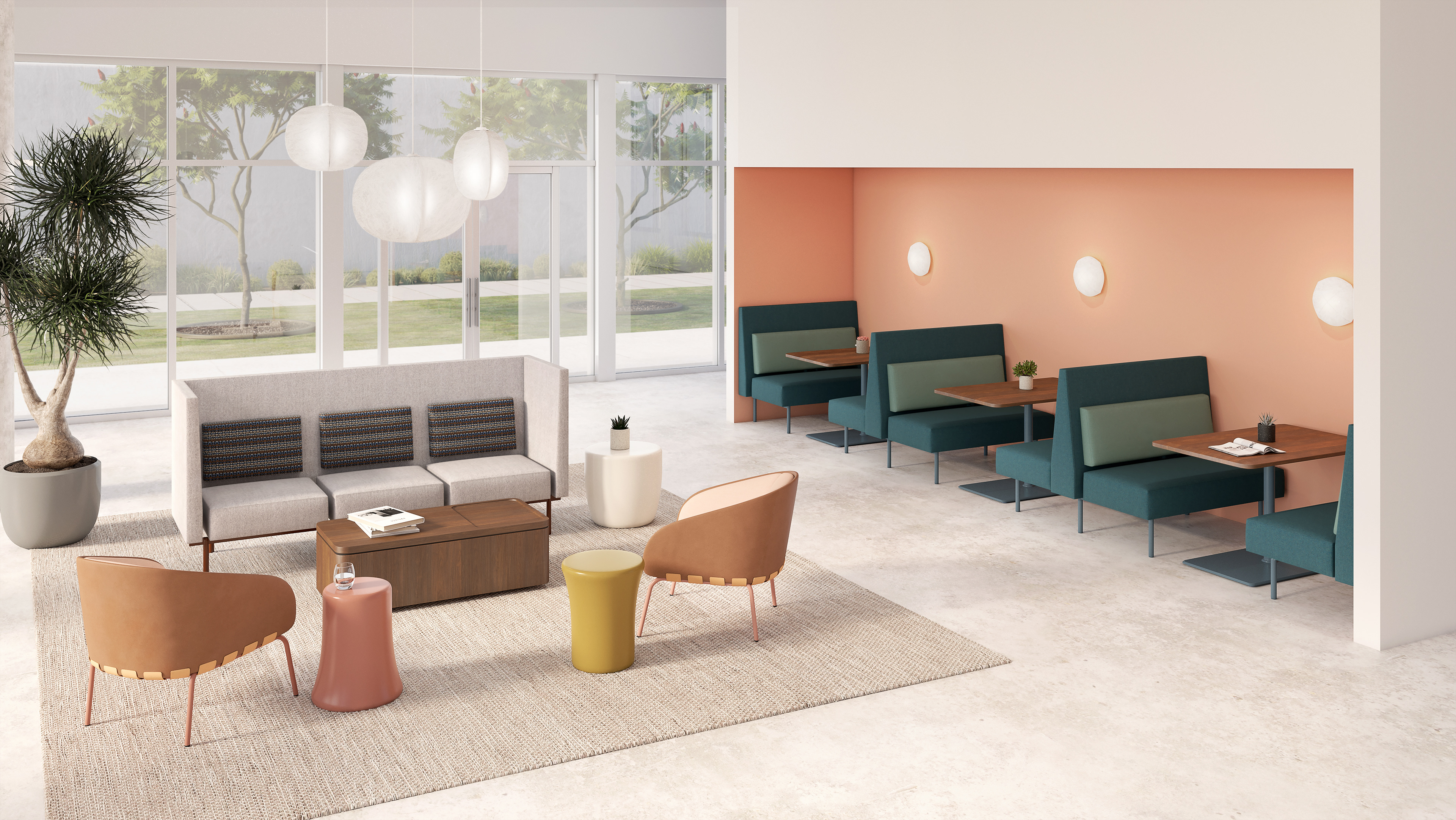 Reveal's clear access to surfaces between seats and backs creates a visually distinctive pattern while also making it an optimal choice for healthcare settings. Lounge seating is available in three back heights to accommodate different levels of privacy. Dining-height banquettes are available in two back heights.